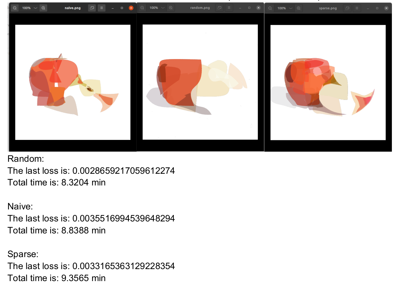- Although the random initialization achieved slightly lower loss values, the sparse initialization produced the best visual output in my evaluation.