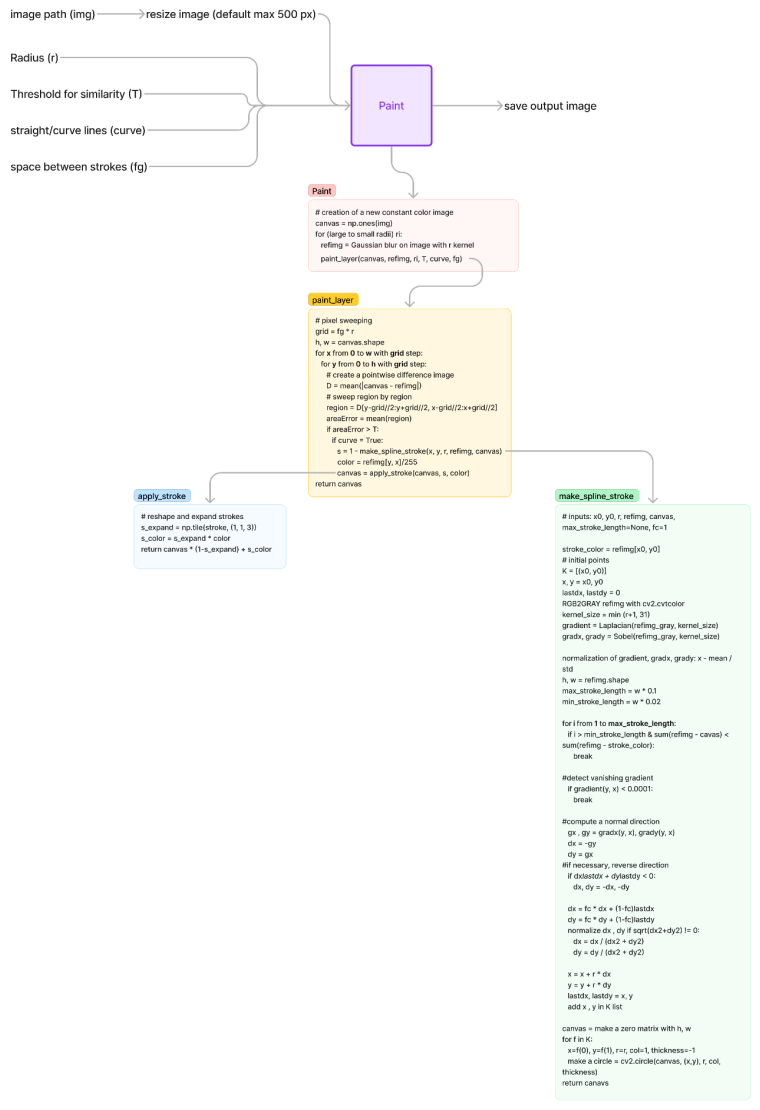 A Python implementation of Aaron Hertzmann’s Painterly rendering algorithm for stroke-based image generation is available this repository. The figure below illustrates the architecture of the main code modules in the GitHub repository. The input variables are input image path, radii, output saving path, threshold of similarity, straight or curved lines, spacing between strokes, and debugging.
